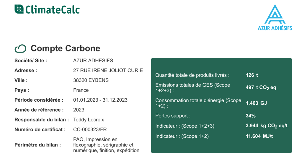 - Amélioration du cycle de vie de nos produits en recyclant le dorsal des étiquettes ➔ 100% de nos déchets de glassine est utilisée en ouate de cellulose pour l’industrie du bâtiment nous estimons une réduction de déchets de 6 tonnes par an.